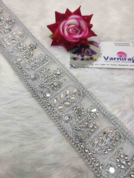 Pearl lace with jarkan stone and Mirror work(9 Meter- 55 MM Width) S 731
