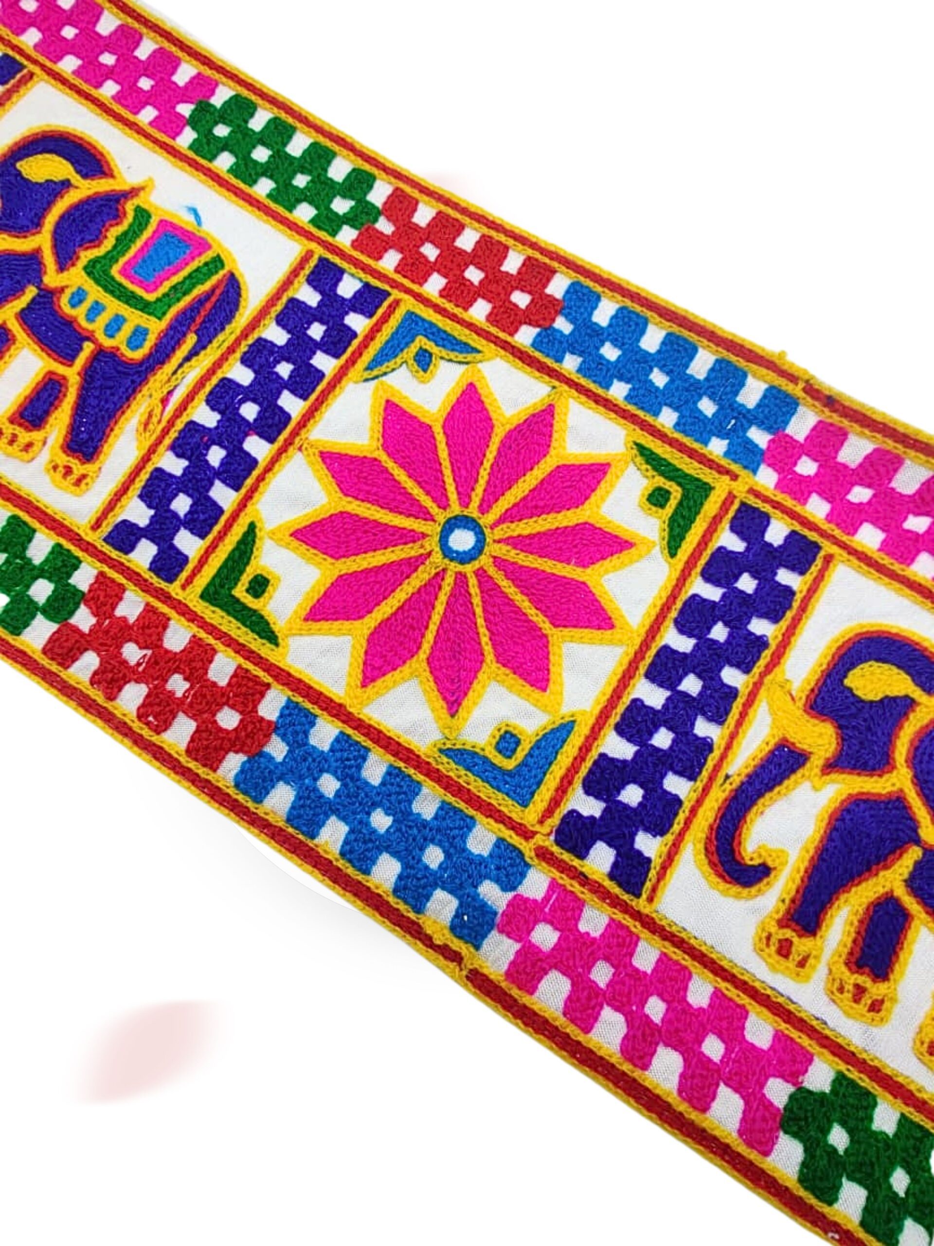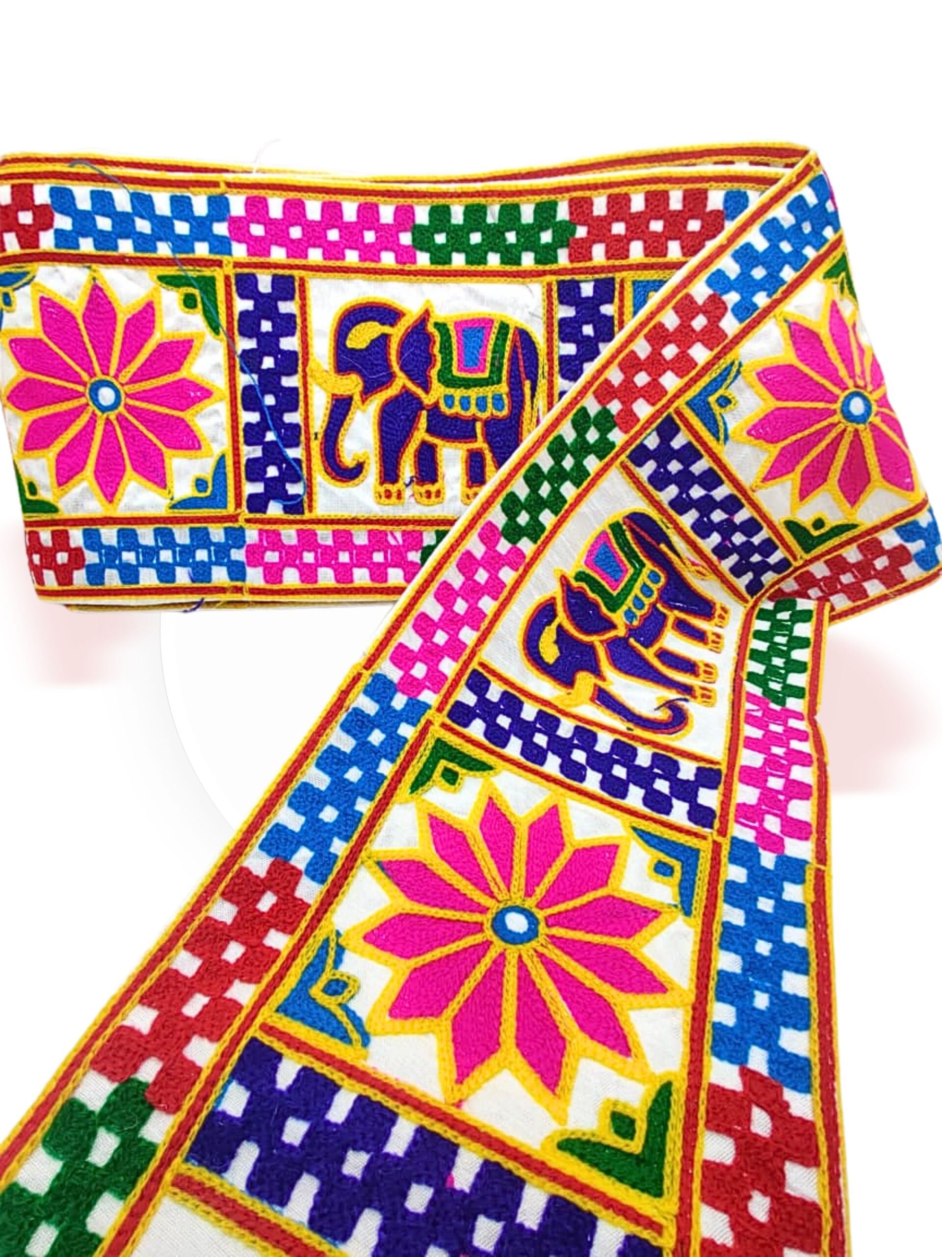 Add a touch of traditional elegance to your ethnic wear and crafts with this beautiful Kutchi Mirror Work Lace Border. Designed with vibrant multicolor thread embroidery and real mirror embellishments, this lace is perfect for enhancing the beauty of sarees, lehengas, blouses, dupattas, kurtis, and festive outfits.