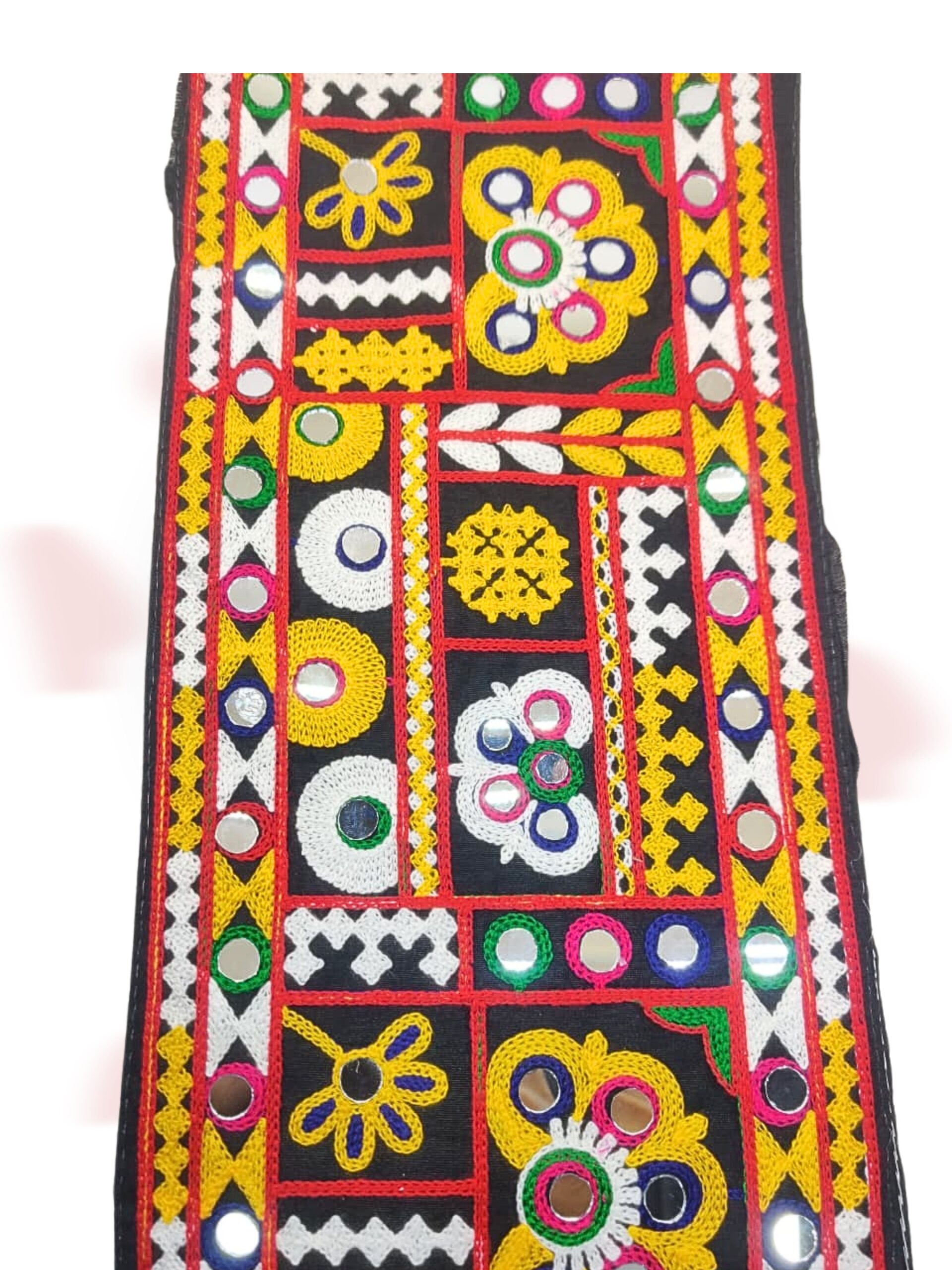 Add a touch of traditional elegance to your ethnic wear and crafts with this beautiful Kutchi Mirror Work Lace Border. Designed with vibrant multicolor thread embroidery and real mirror embellishments, this lace is perfect for enhancing the beauty of sarees, lehengas, blouses, dupattas, kurtis, and festive outfits.