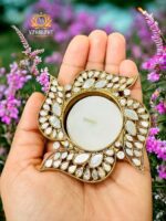 Category: Other accessories Tags: #kundan tealight holder, #leaf design tealight holder, #mirror work diya