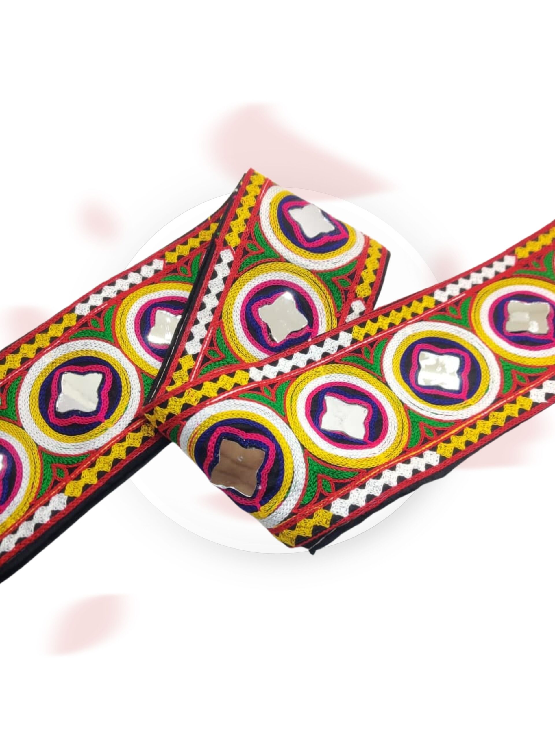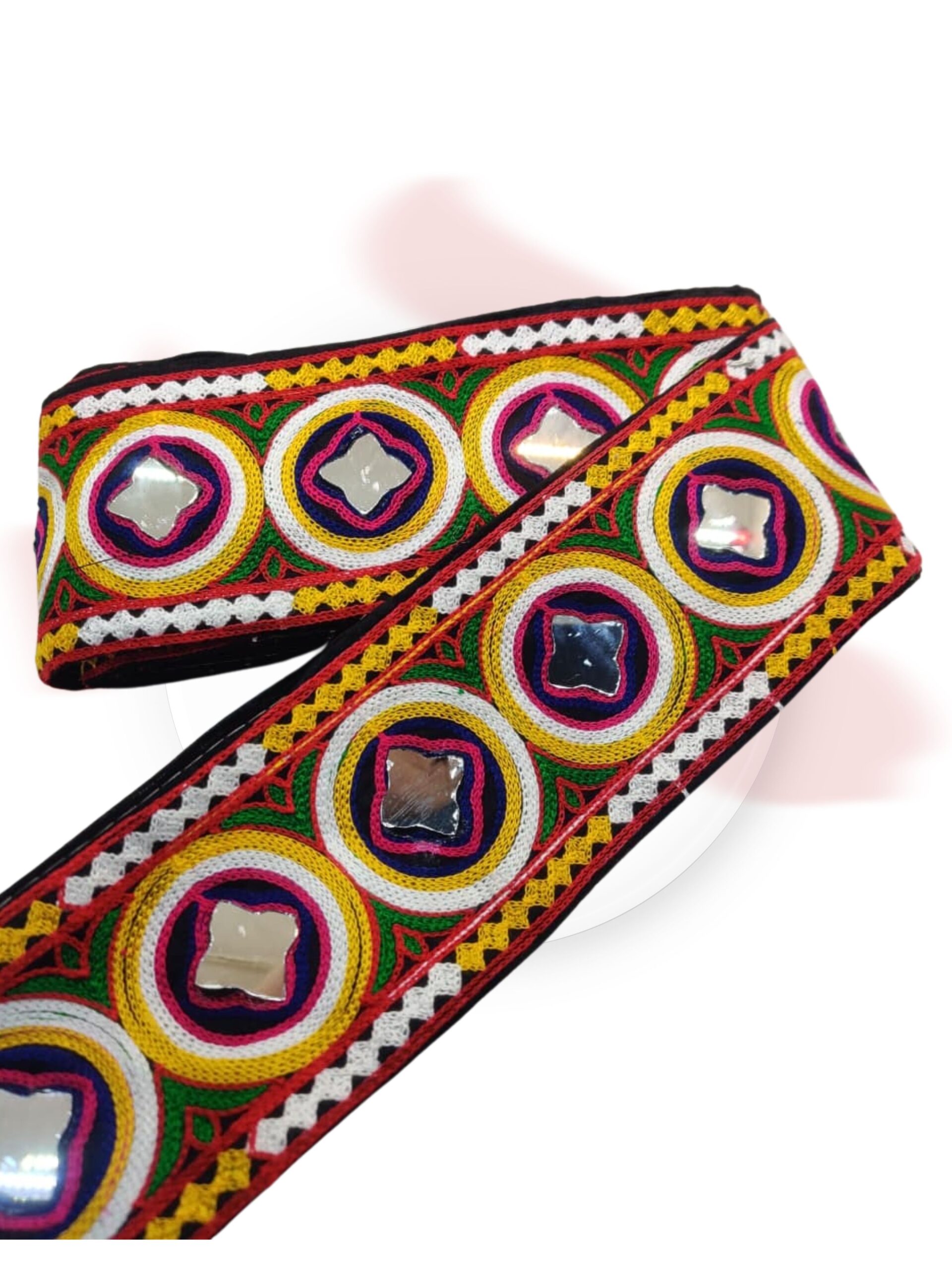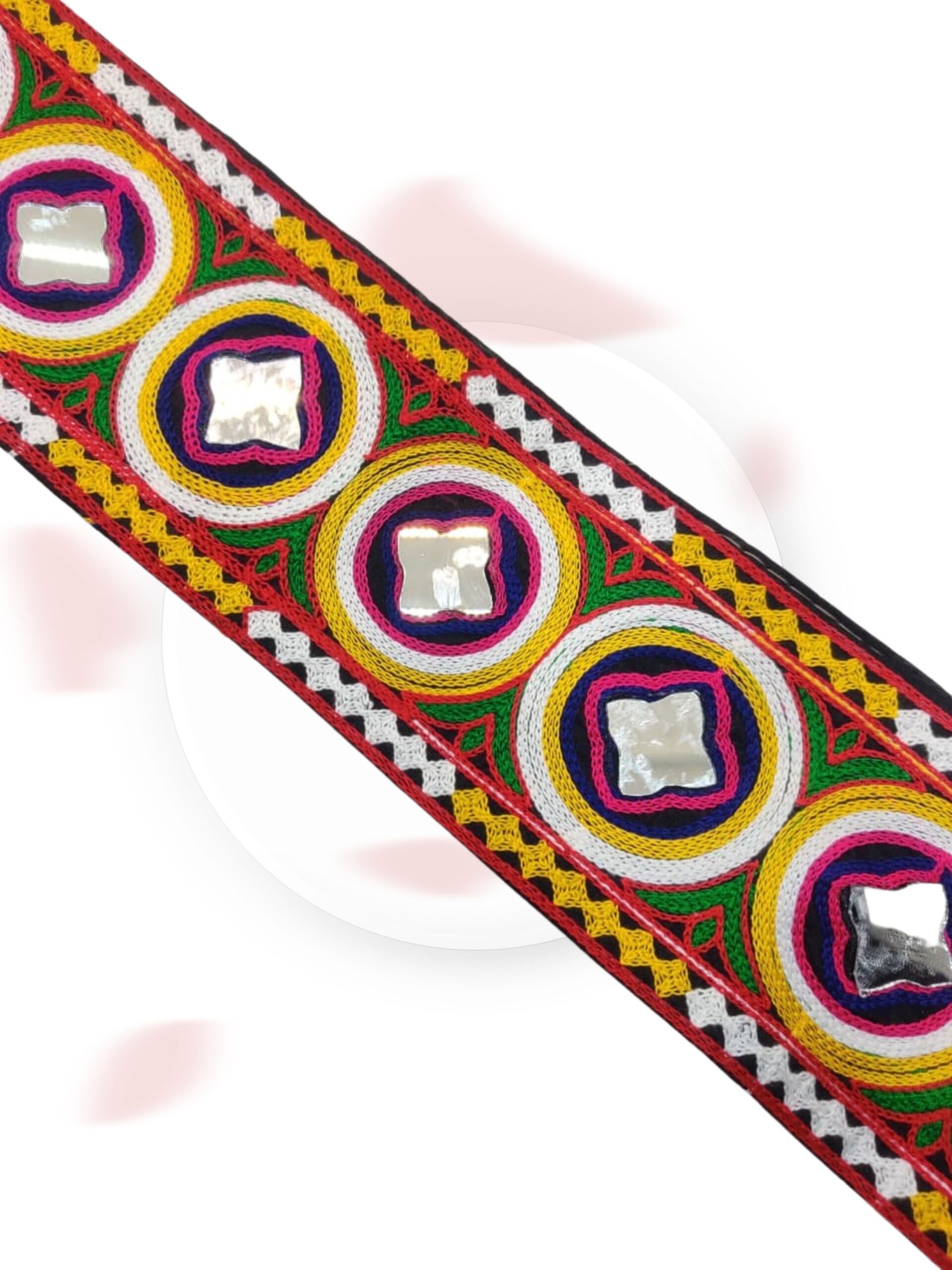 PREMIUM HANDMADE LACE! Add vibrant ethnic charm to your outfits with this Multicolor Traditional Kutchi Embroidery Lace with mirror work – perfect for Chaniya Choli, Baby Frocks, Balvuj Sarees, Dupattas, Blouses, and Craft Projects.