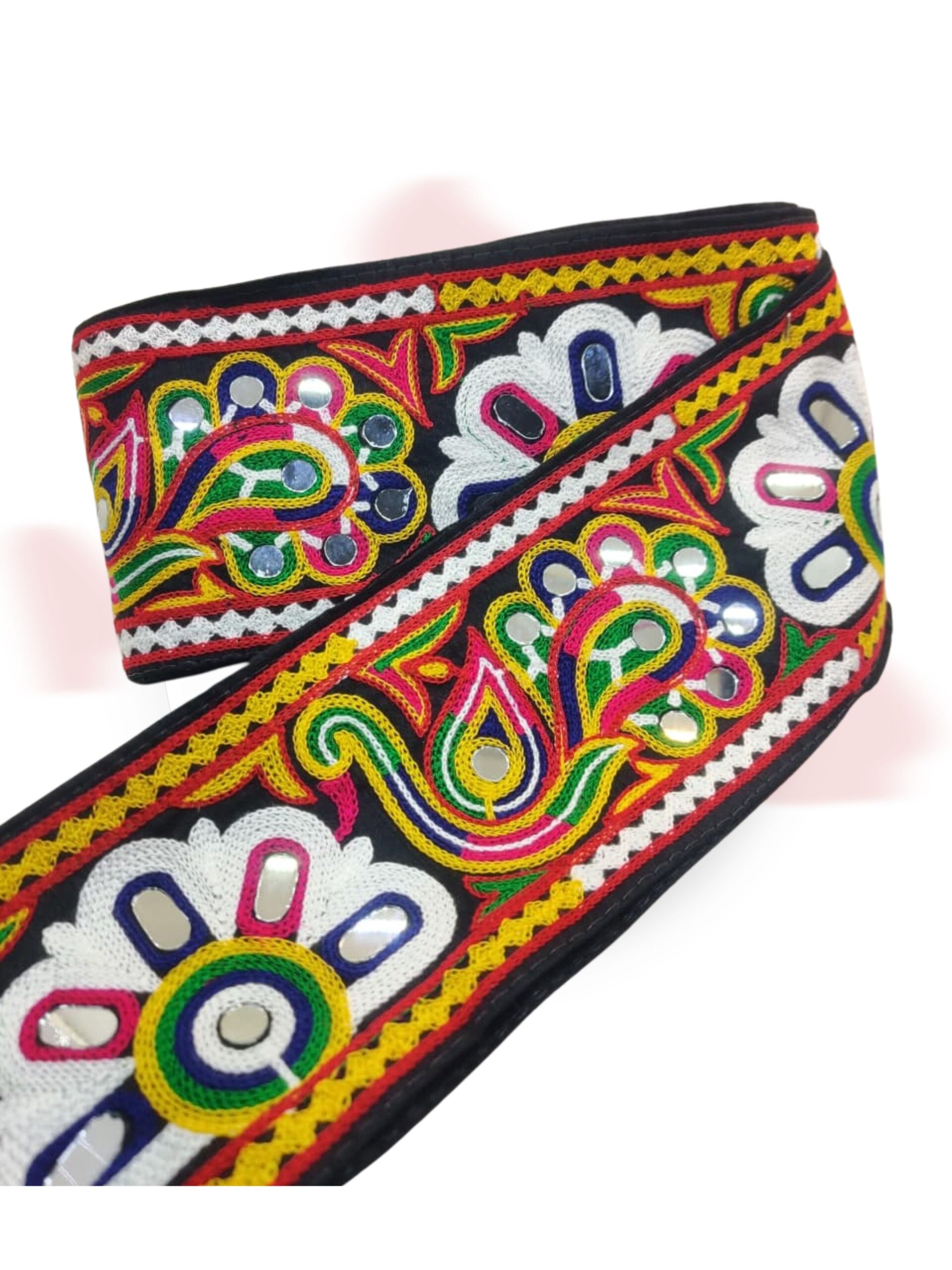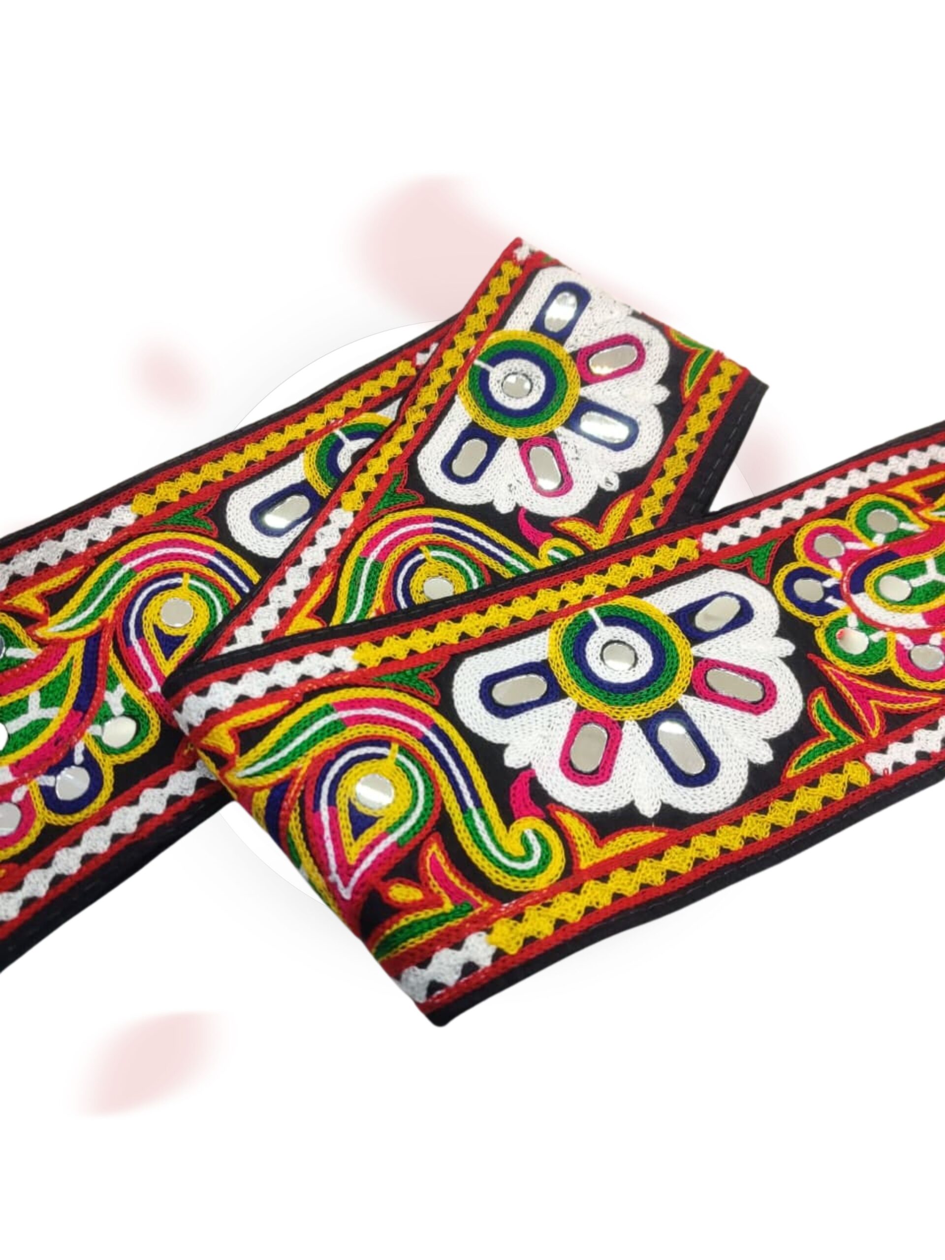 PREMIUM HANDMADE LACE! Add vibrant ethnic charm to your outfits with this Multicolor Traditional Kutchi Embroidery Lace with mirror work – perfect for Chaniya Choli, Baby Frocks, Balvuj Sarees, Dupattas, Blouses, and Craft Projects.