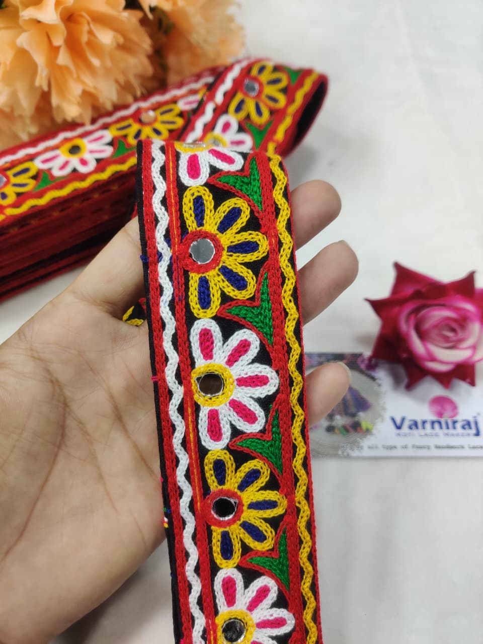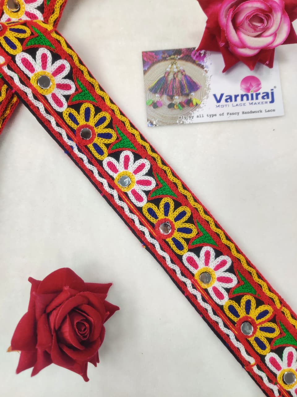This is a beautiful Kachi embroidery lace, featuring traditional mirror work and vibrant, multi-colored floral patterns. The lace is made from a high-quality thread that provides a rich, handcrafted look and feel. The small, circular mirrors are securely stitched into the design, adding a sparkling, eye-catching element that catches the light.