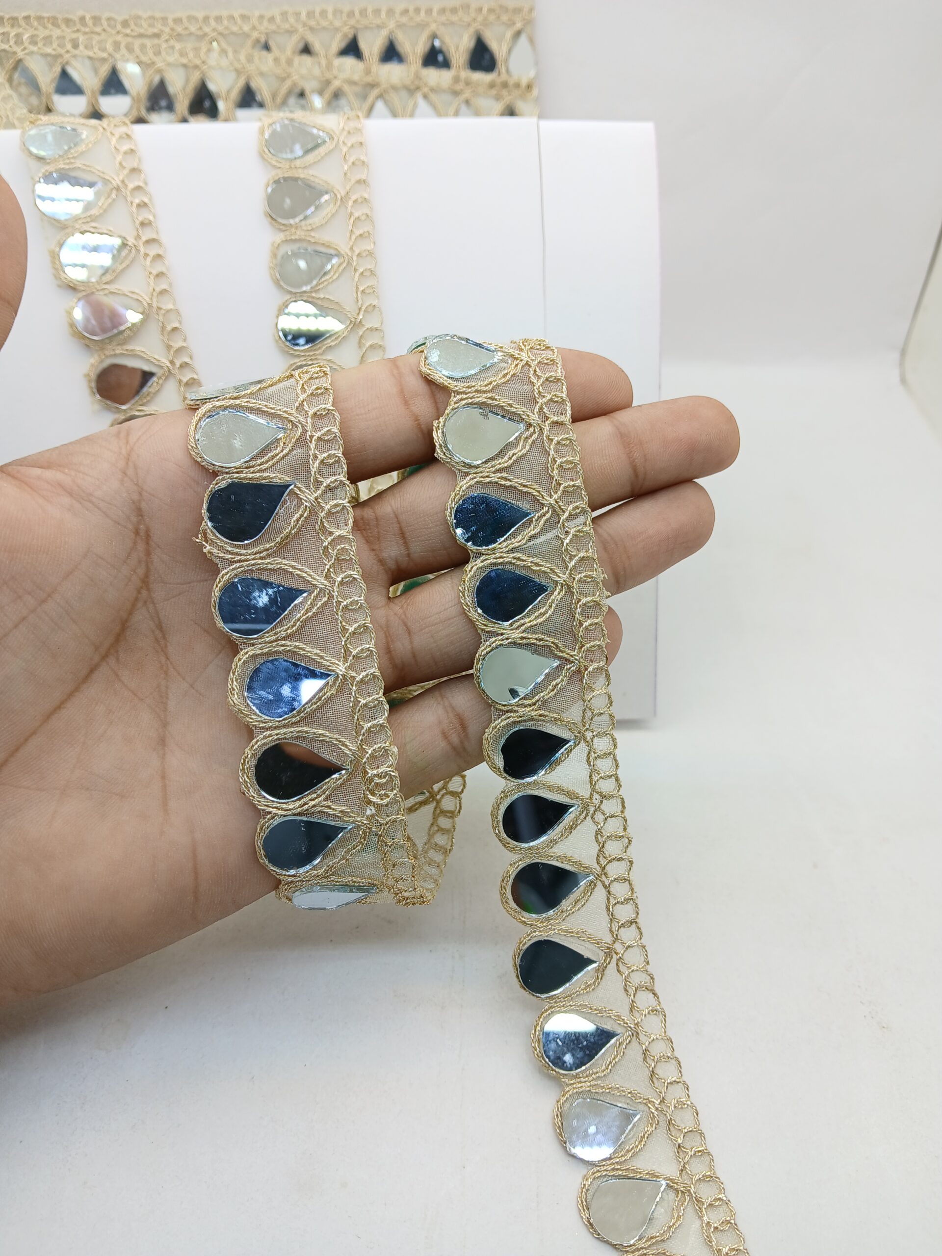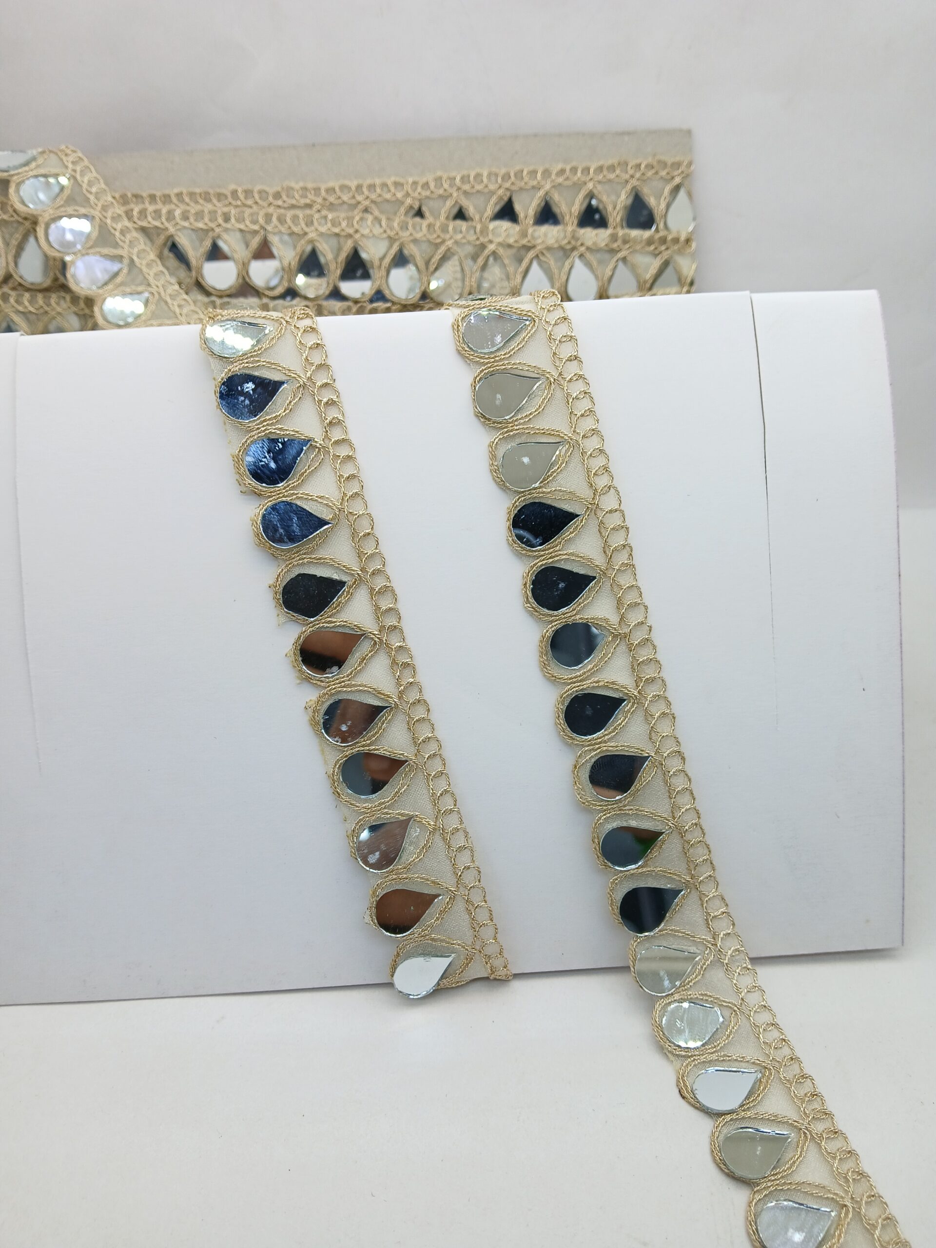 This elegant Mirror lace features teardrop-shaped mirror-like embellishments intricately woven into a gold thread design. Perfect for adding a touch of traditional glamour to clothing, accessories, or home decor. The lace showcases a beautiful blend of gold and reflective mirror elements, ideal for festive or ethnic wear.