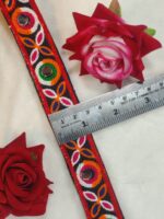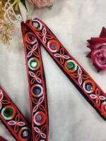 This exquisite lace features intricate embroidery with a mix of red, orange, green, blue, and white threads, creating a visually appealing pattern. The lace is adorned with rectangular mirrors at its center, adding a touch of elegance and cultural significance. The Kutchi style of embroidery is characteristic of the Kutch region in Gujarat, India, known for its rich textile heritage. The lace is likely used as a decorative trim or border for traditional clothing or home decor items, showcasing the beauty of Indian craftsmanship.