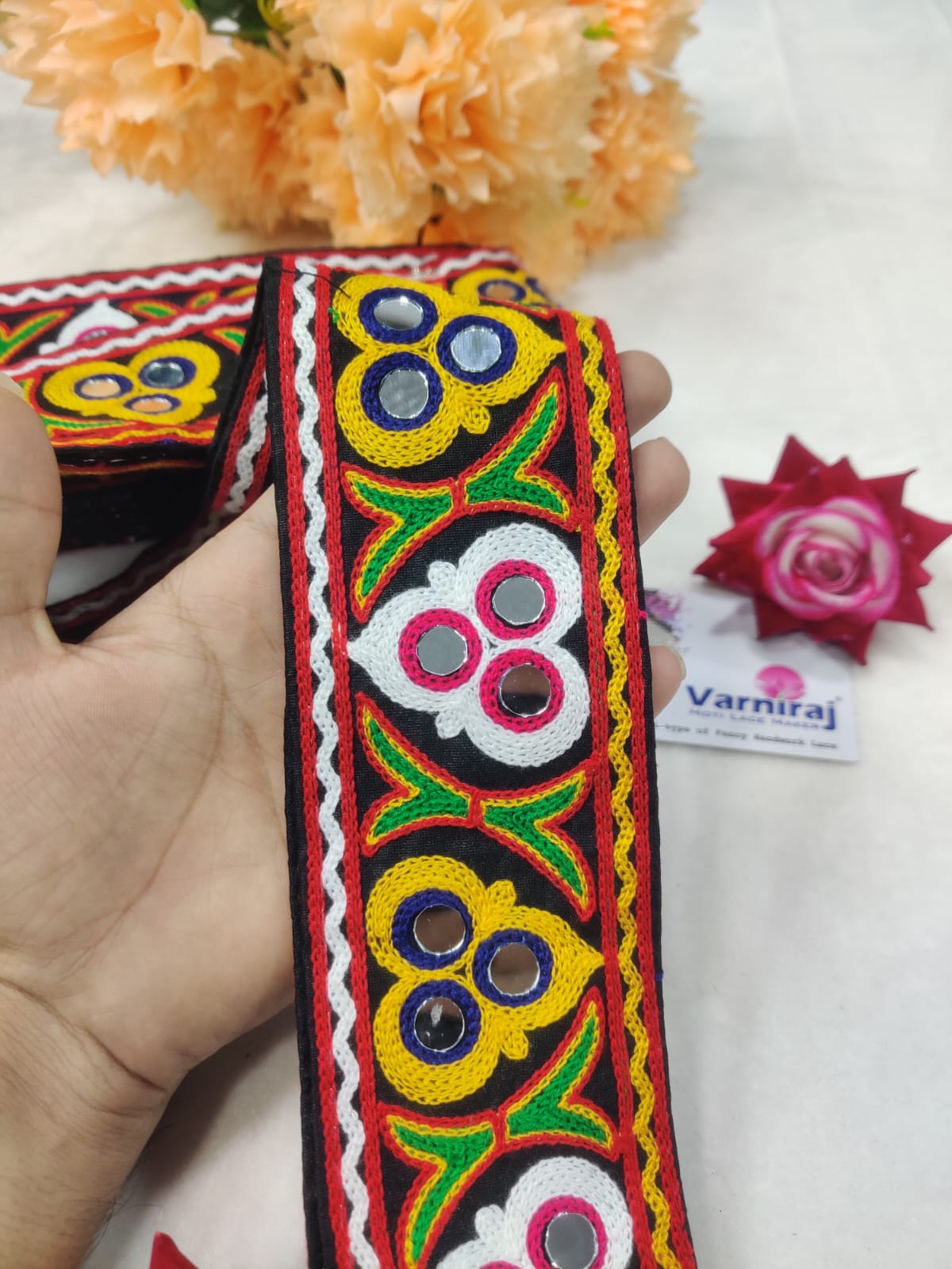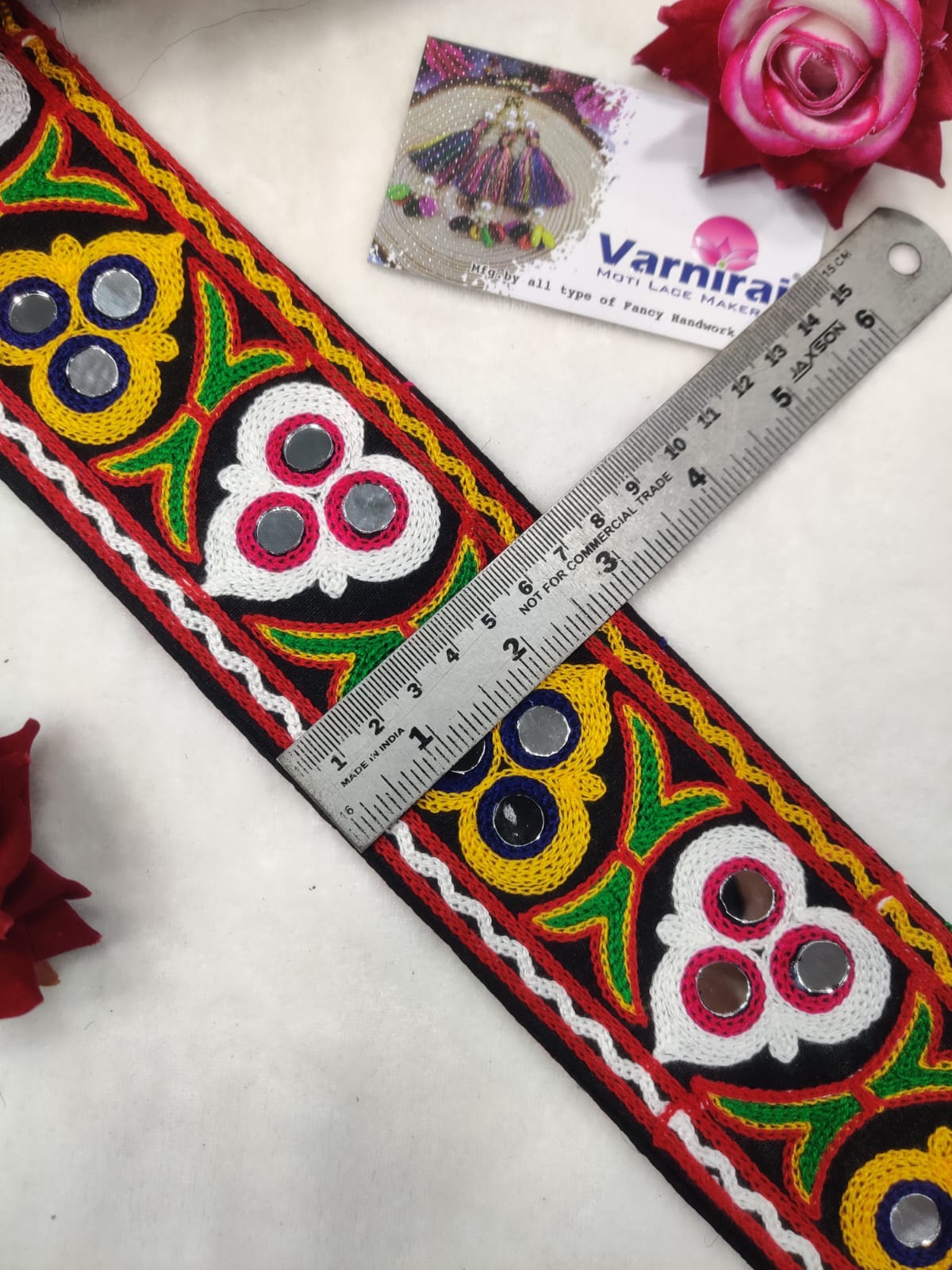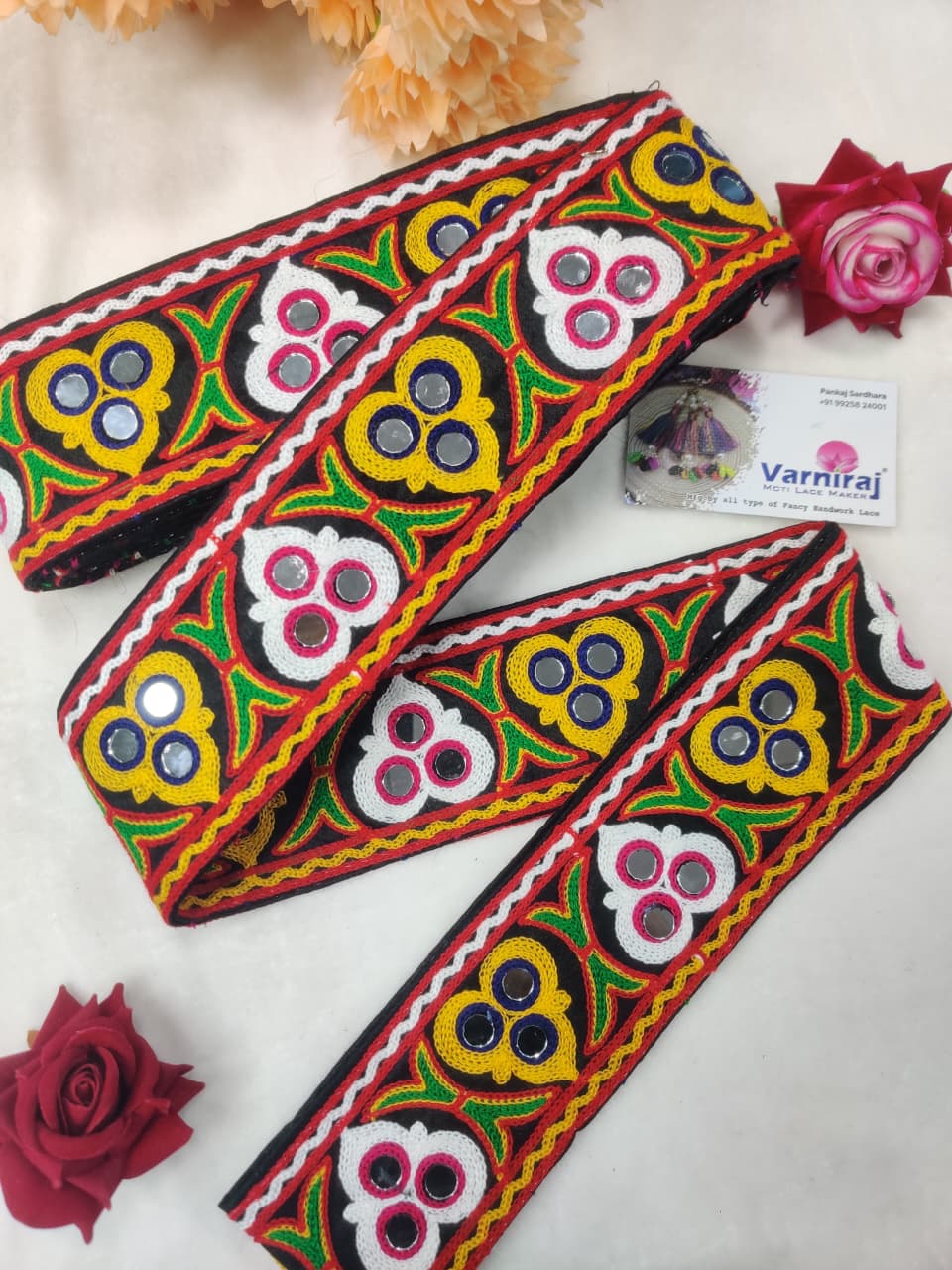 varniart traditional gamthi kachhi miror work lace border use for navratri collection, saree ,suits, dupattas, chaniyacholi, decoration,merrage collection , art and craft , etc…(9meter, 65mm width)-S 453