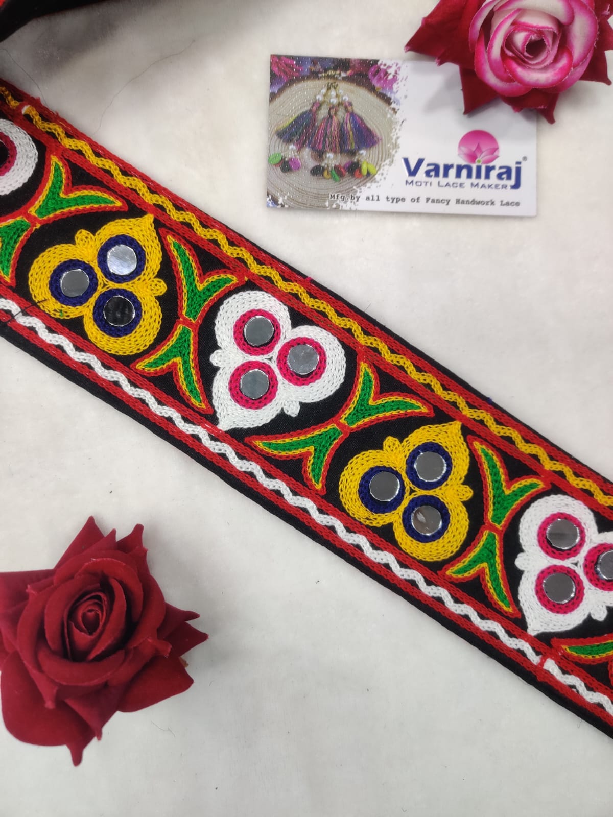 Elevate your ethnic wear with this exquisite traditional Kutchh/Gamthi work lace border. This beautiful trim features intricate handwork embroidery in a vibrant, multi-color pattern on a classic black base. The lace is richly adorned with small, shimmering mirrors (mirror work) and subtle pearls (moti work), adding a touch of authentic, festive sparkle.