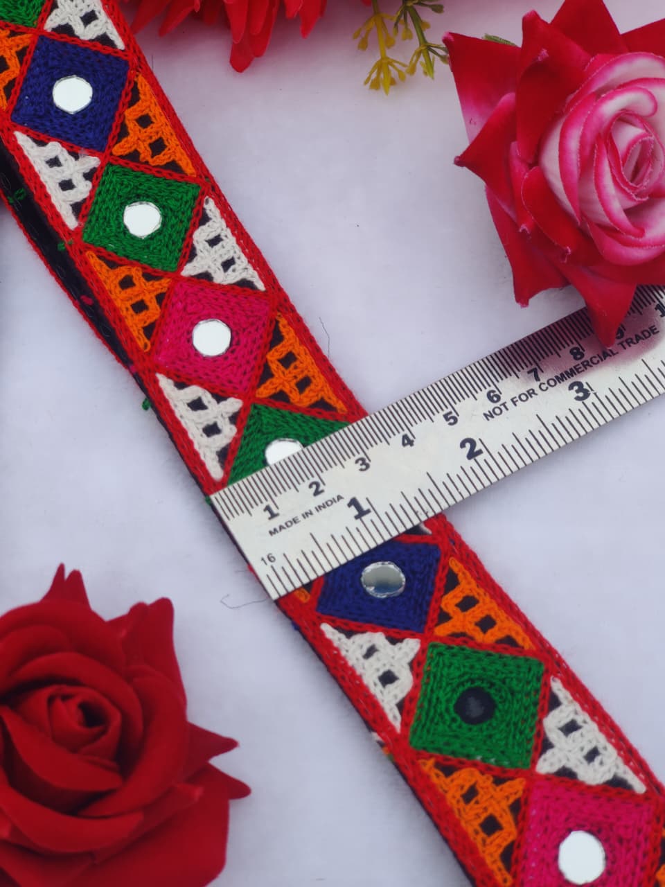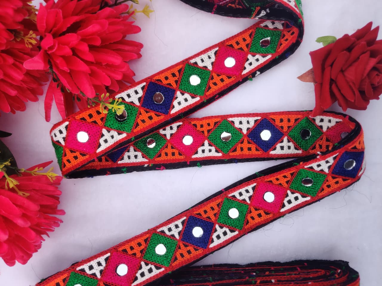 This exquisite embroidered lace trim features intricate embroidery and mirror work, perfect for adding a touch of traditional Indian charm to your garments or home decor. The vibrant colors and geometric patterns create a beautiful and eye-catching effect, making it a versatile and stylish accessory.