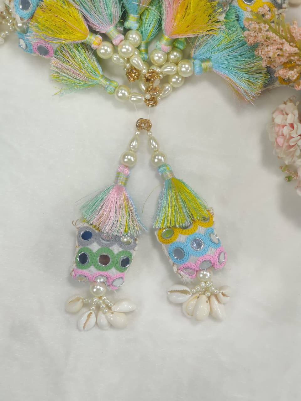 A beautiful, colorful latkan adorned with pearls, shells, and intricate mirror work. Featuring soft pastel hues, this latkan adds a touch of elegance and sophistication to any outfit or accessory. Handcrafted with attention to detail, it’s a perfect blend of traditional craftsmanship and stylish charm.