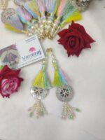 A beautiful, colorful latkan adorned with pastel tassels, pearls, and intricate mirror work. Featuring soft pastel hues, this latkan adds a touch of elegance and sophistication to any outfit or accessory. Handcrafted with attention to detail, it’s a perfect blend of traditional craftsmanship and stylish charm.