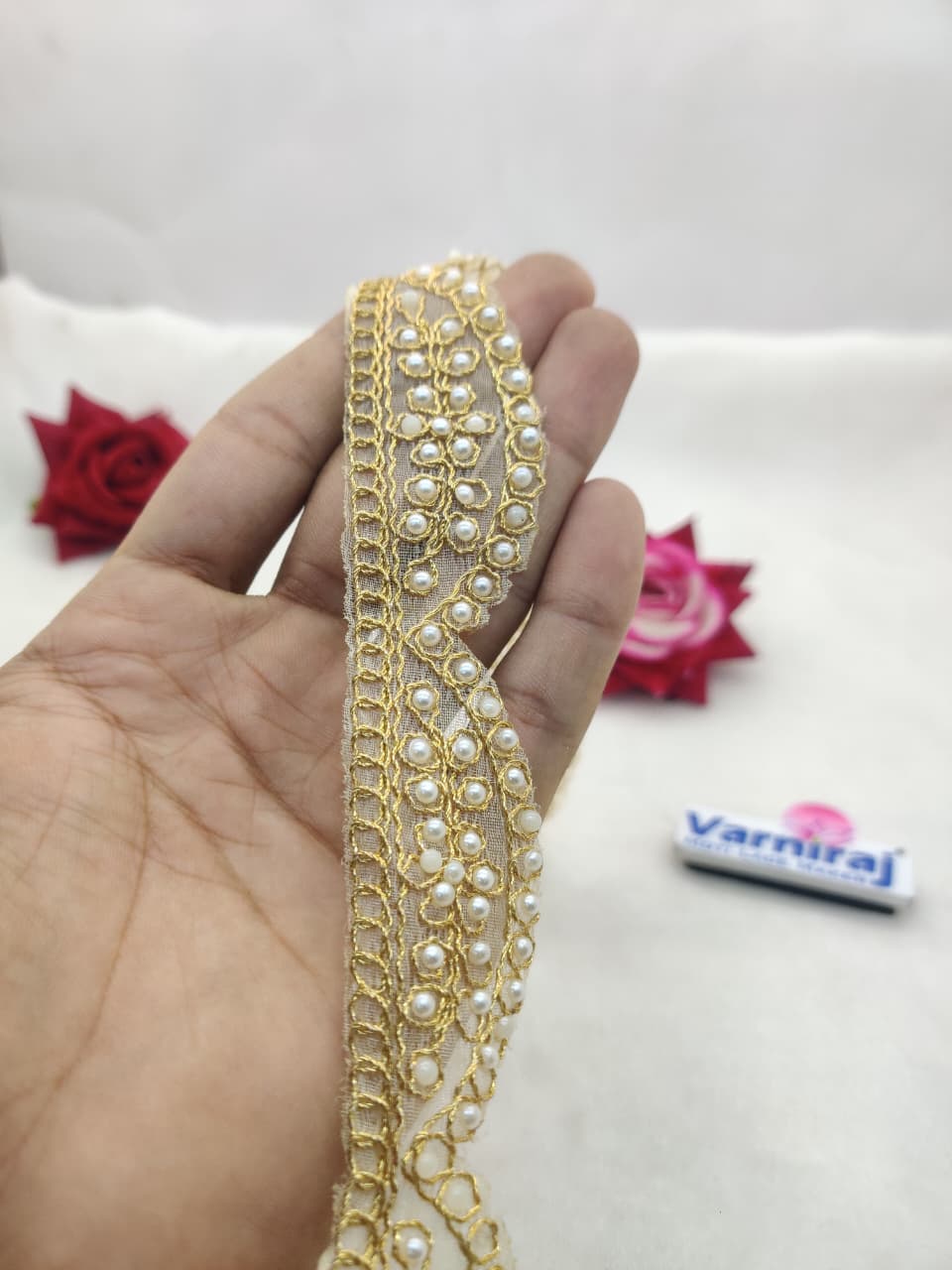 Varniart Amazing Round Pearl & Jarkan Stone Lace Border (9 Meter- 40 MM Width) S 832