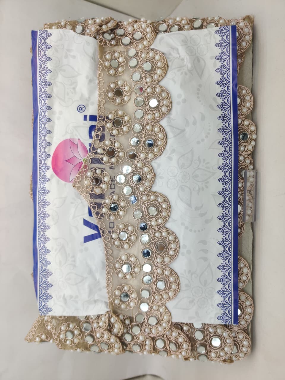 Add elegance and richness to your outfits with this White Pearl & Mirror Embroidery Lace Border. Designed with intricate round floral patterns, this lace features shimmering mirrors and delicate pearl beadwork, giving a royal and festive touch. Perfect for sarees, lehengas, dupattas, blouses, gowns, and ethnic wear, it enhances bridal and party collections with its luxurious look. Its scalloped design and fine detailing make it ideal for wedding dresses, festive outfits, and decorative purposes.