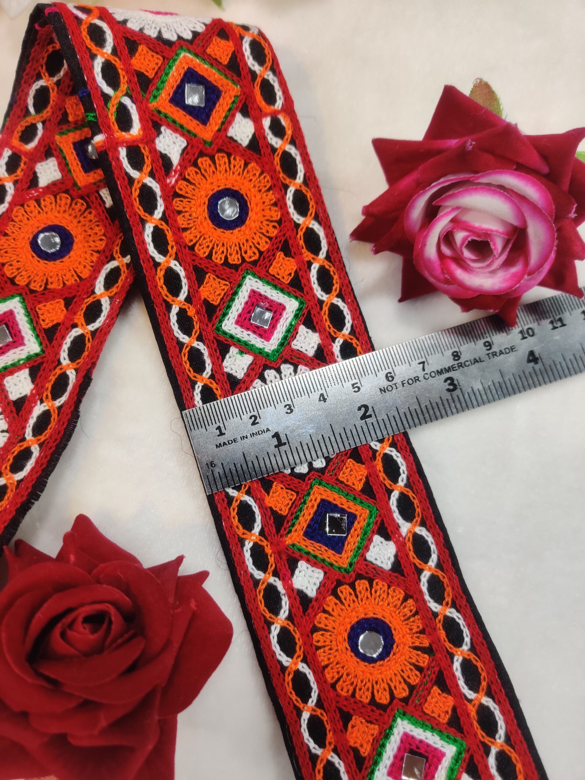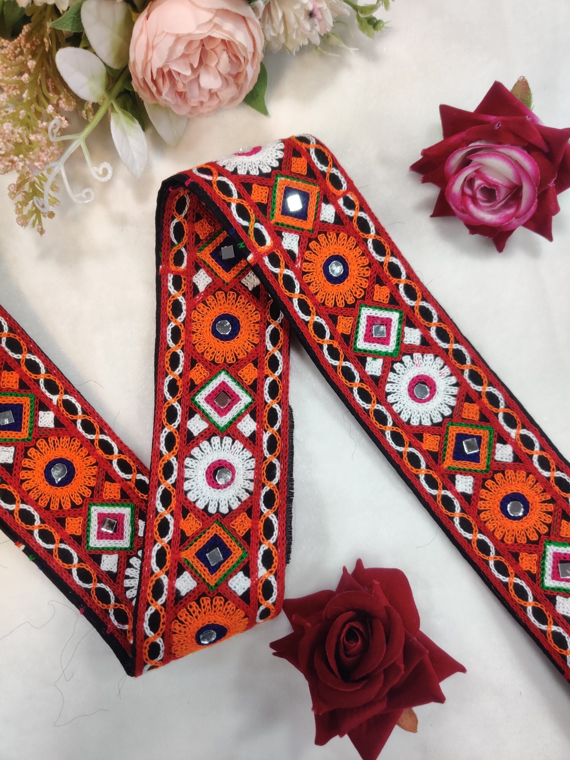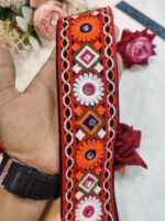 Bring a vibrant ethnic charm to your creations with this traditional Kachi embroidery lace featuring intricate multicolor threadwork and hand-embellished mirror details. Designed with bold orange, white, green, and red patterns, this lace adds a festive touch to sarees, dupattas, blouses, lehengas, and home décor. The durable fabric base ensures long-lasting quality, while the handcrafted detailing reflects authentic Gujarati artistry. Perfect for Navratri, weddings, and cultural outfits.