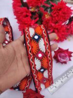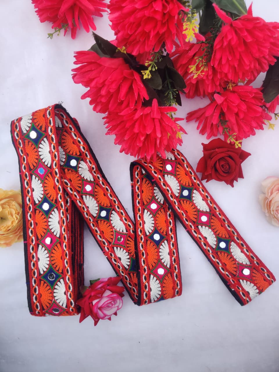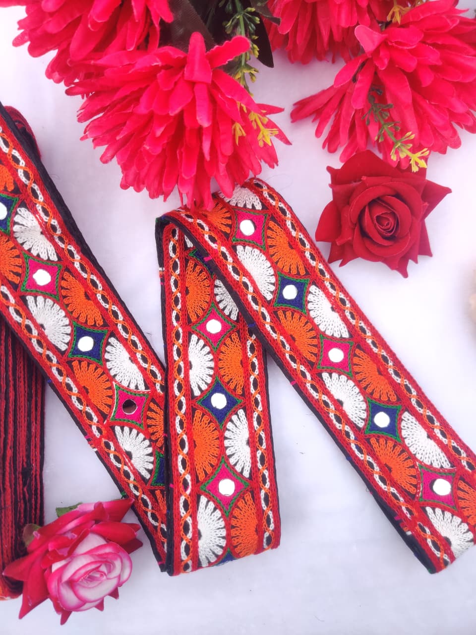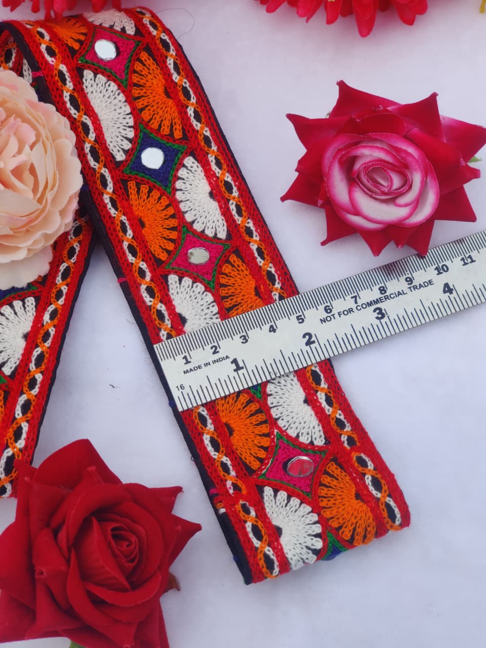 This stunning embroidered trim features a colorful and intricate design with mirror work, showcasing a mix of red, orange, white, green, and blue hues on a black background. The trim is adorned with small mirrors that add a touch of elegance and sophistication.