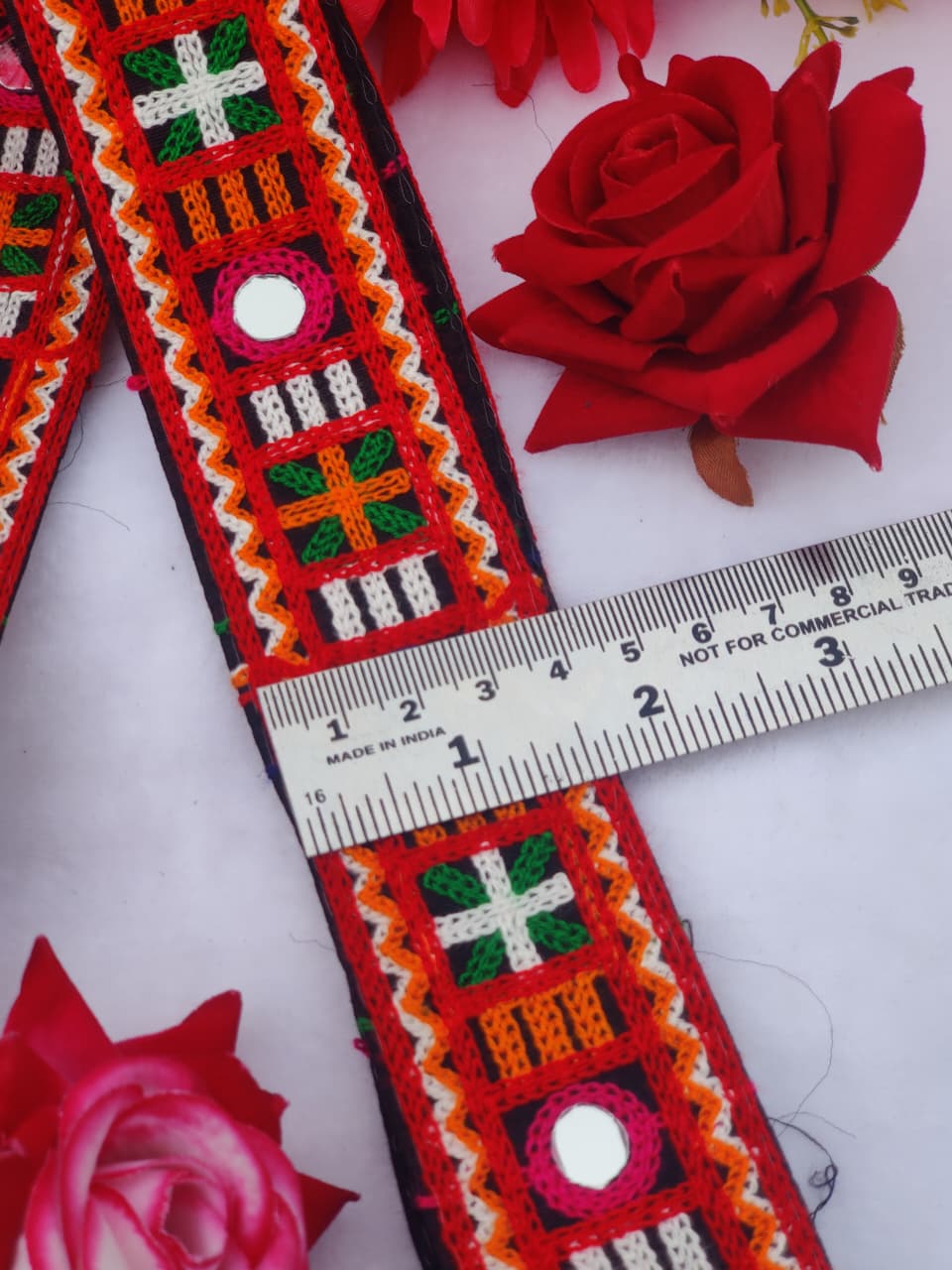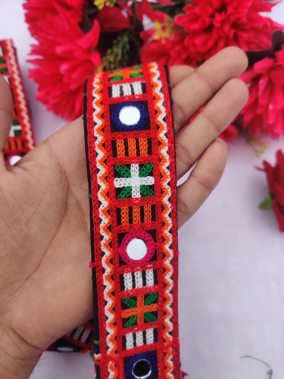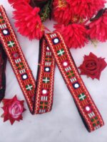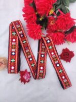 Add a touch of traditional Indian elegance to your garments or home decor with this stunning embroidered lace trim. Featuring intricate embroidery and mirror work, this lace is perfect for adding a decorative touch to your creations. The vibrant colors and geometric patterns create a beautiful and eye-catching effect, making it a versatile and stylish accessory.