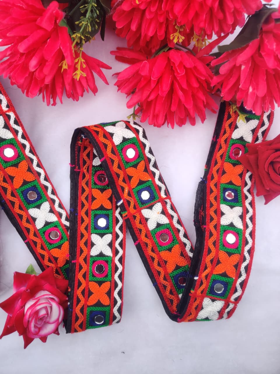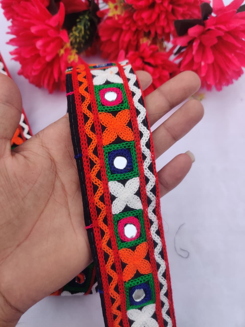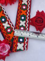 This exquisite embroidered lace trim features intricate embroidery and mirror work, perfect for adding a touch of traditional Indian charm to your garments or home decor. The vibrant colors and geometric patterns create a beautiful and eye-catching effect, making it a versatile and stylish accessory.
