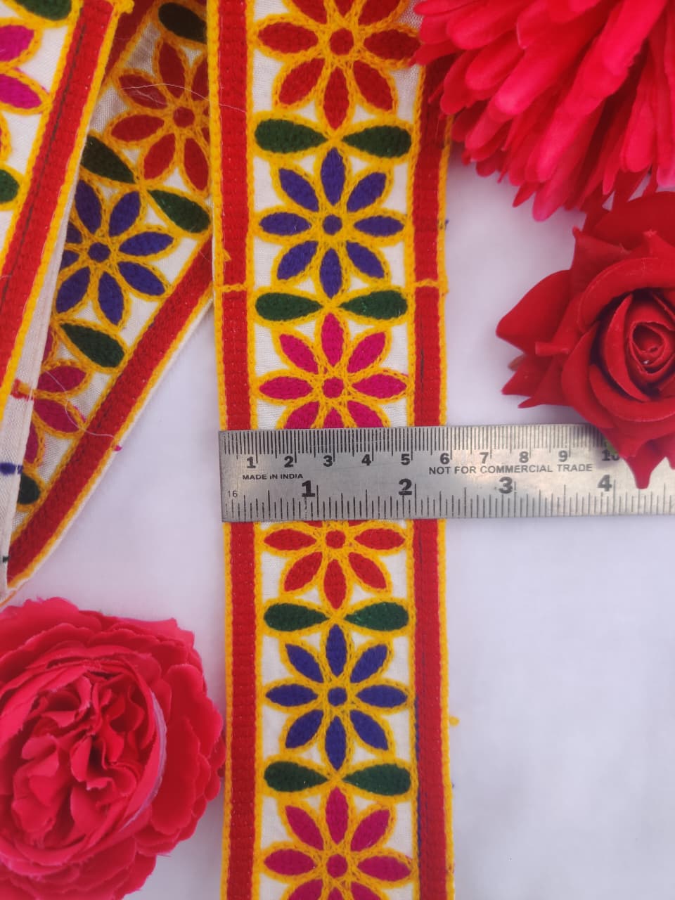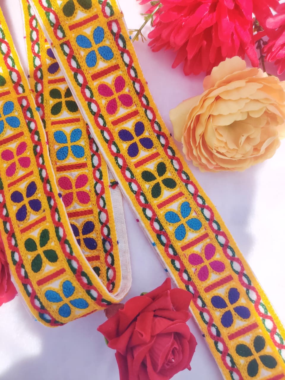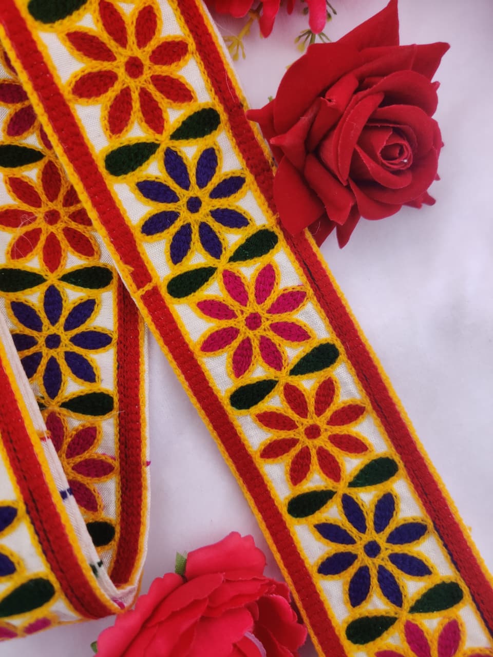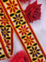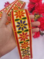 Brighten up your ethnic and festive outfits with this multicolor floral embroidery lace border. Crafted on a soft white fabric base with red and yellow edges, this lace features vibrant flower motifs in yellow, purple, green, red, and pink. Its colorful and traditional look makes it perfect for lehenga, saree, kurti, dupatta, blouse, home décor, or craft projects. A versatile choice for adding a cheerful and decorative finish to any design.