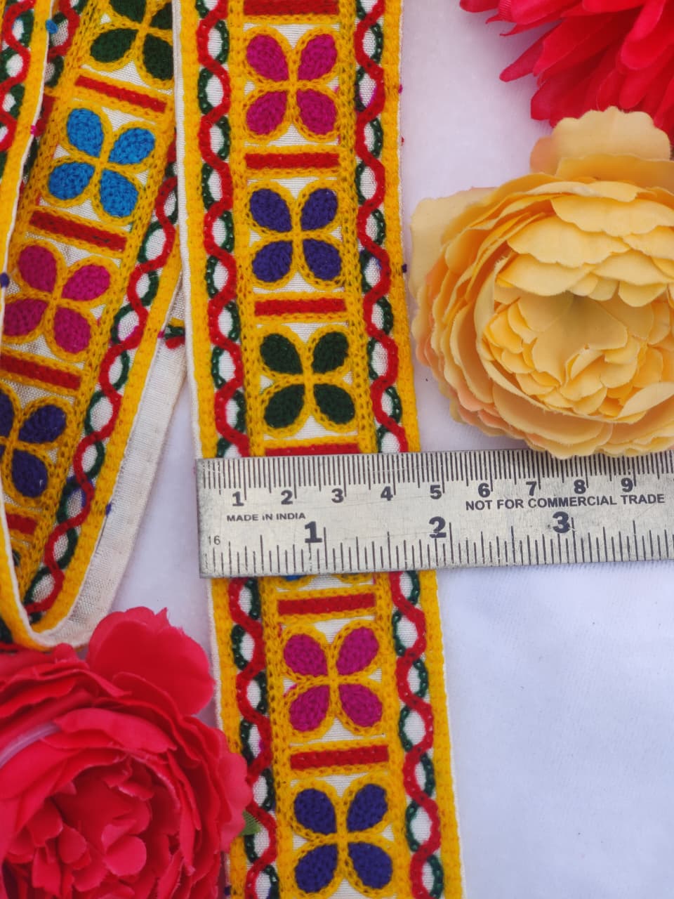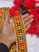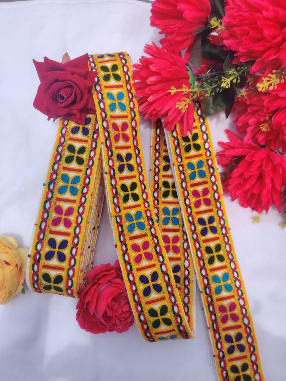 Add a vibrant touch to your ethnic wear with this multicolor embroidery lace border. Designed with geometric floral patterns in green, blue, pink, purple, and yellow, the lace is set on a white base with yellow edges and decorative red-green detailing. Its colorful and traditional look makes it ideal for sarees, lehengas, dupattas, kurtis, blouses, and festive crafts. A perfect choice for enhancing garments with a bright and cultural appeal.