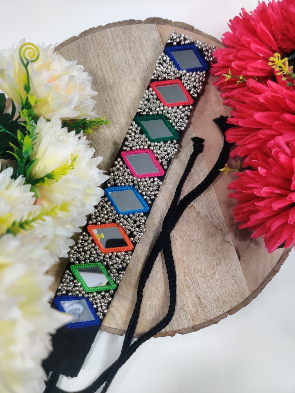 This stunning waist belt features traditional diamond-shaped mirror work, beautifully bordered with metallic bead embellishments. Each mirror is highlighted with colorful embroidery in shades of orange, green, yellow, blue, and red, giving it a vibrant festive look. Crafted on a durable black fabric base with braided tie-up strings, this belt is perfect for pairing with lehengas, sarees, chaniya cholis, and other ethnic wear. Ideal for Navratri, weddings, and festive occasions, it adds a graceful and traditional charm to your outfit.