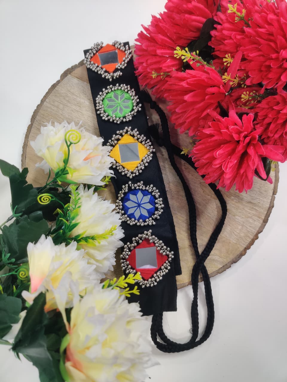 This stunning waist belt features traditional diamond-shaped mirror work, beautifully bordered with metallic bead embellishments. Each mirror is highlighted with colorful embroidery in shades of orange, green, yellow, blue, and red, giving it a vibrant festive look. Crafted on a durable black fabric base with braided tie-up strings, this belt is perfect for pairing with lehengas, sarees, chaniya cholis, and other ethnic wear. Ideal for Navratri, weddings, and festive occasions, it adds a graceful and traditional charm to your outfit.