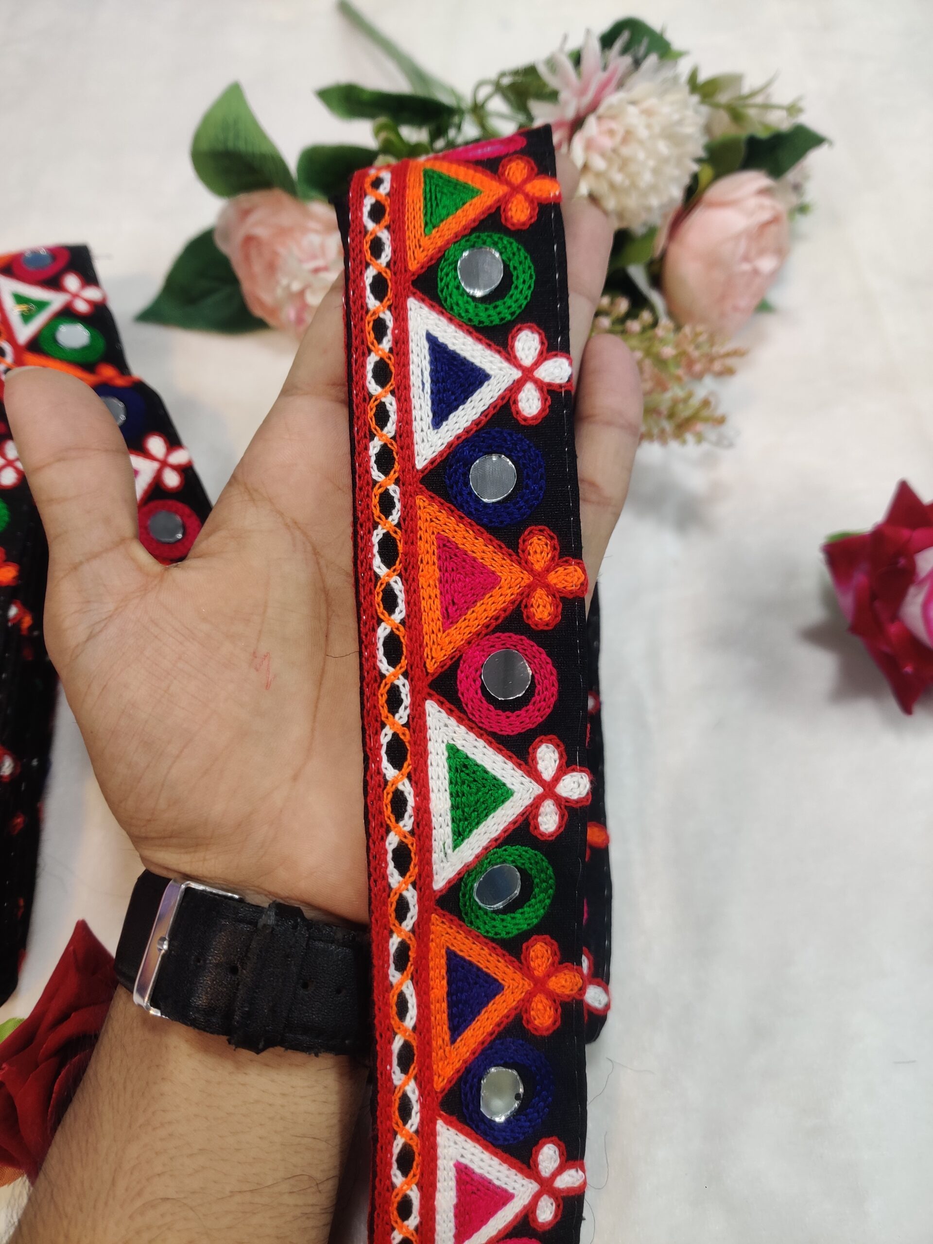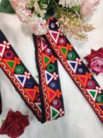 This exquisite lace features intricate embroidery with a mix of red, orange, green, blue, and white threads, creating a visually appealing pattern. The lace is adorned with rectangular mirrors at its center, adding a touch of elegance and cultural significance. The Kutchi style of embroidery is characteristic of the Kutch region in Gujarat, India, known for its rich textile heritage. The lace is likely used as a decorative trim or border for traditional clothing or home decor items, showcasing the beauty of Indian craftsmanship.