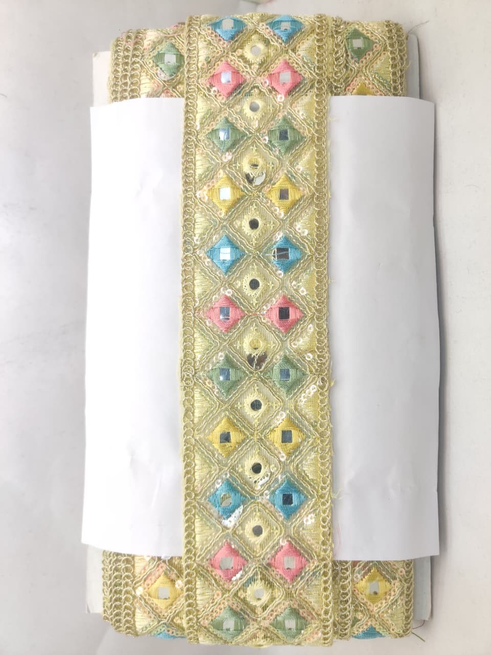 Add a touch of luxury to your garments or home decor with this exquisite golden diamond mirror lace trim. Featuring a repeating pattern of pastel-colored diamonds embroidered on a gold-colored fabric, this lace is perfect for adding a decorative border to clothing, accessories, or home furnishings. The intricate embroidery and small mirrors or sequins add a level of sophistication and glamour, making it ideal for special occasions or everyday use.