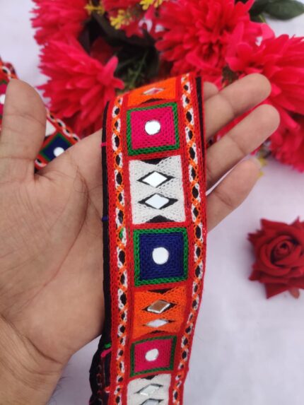 Home Kachhi concept varniart traditional gamthi kachhi miror work lace border use for navratri collection, saree ,suits, dupattas, chaniyacholi, decoration,merrage collection , art and craft , etc…(9 meter, 50mm width)-S 445
