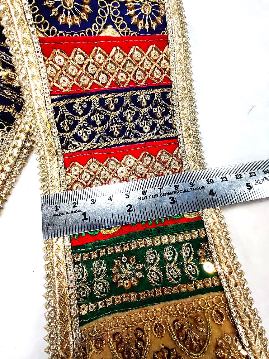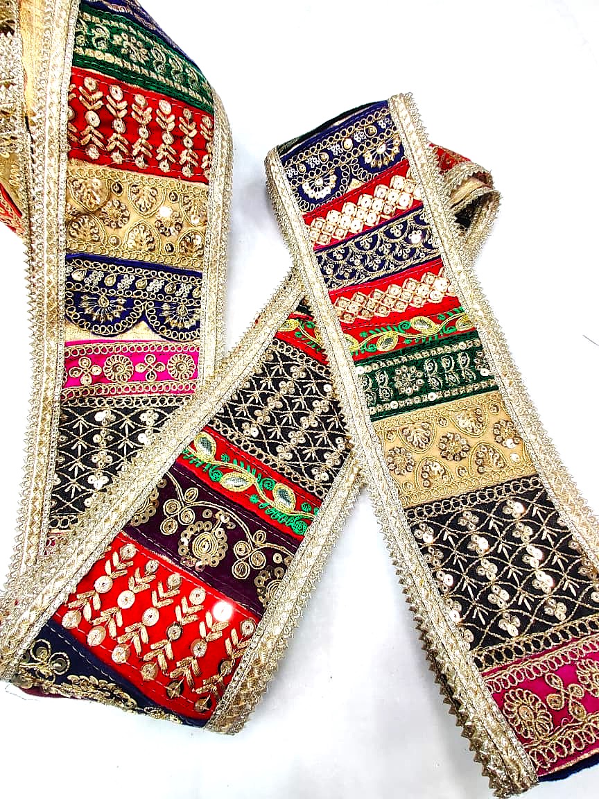 Add a touch of elegance to your garments or home decor with our exquisite embroidered lace. Handcrafted with precision and care, this lace features intricate gold thread embroidery, mirror work, and other embellishments that give it a rich and luxurious appearance. Available in a range of colors, including blue, pink, green, and black, this lace is perfect for adding a pop of color and sophistication to your designs. Whether you’re looking to create traditional Indian attire or simply want to add a decorative touch to your home, this lace is sure to impress.