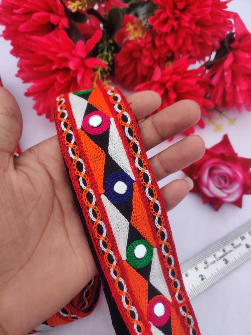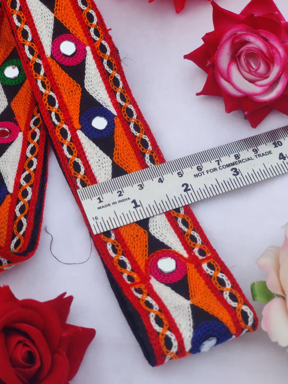 This fabric strip showcases traditional Indian embroidery, characterized by its bold colors and mirror work. The design is reminiscent of Kutchi craftsmanship, known for its intricate patterns and use of mirrors.