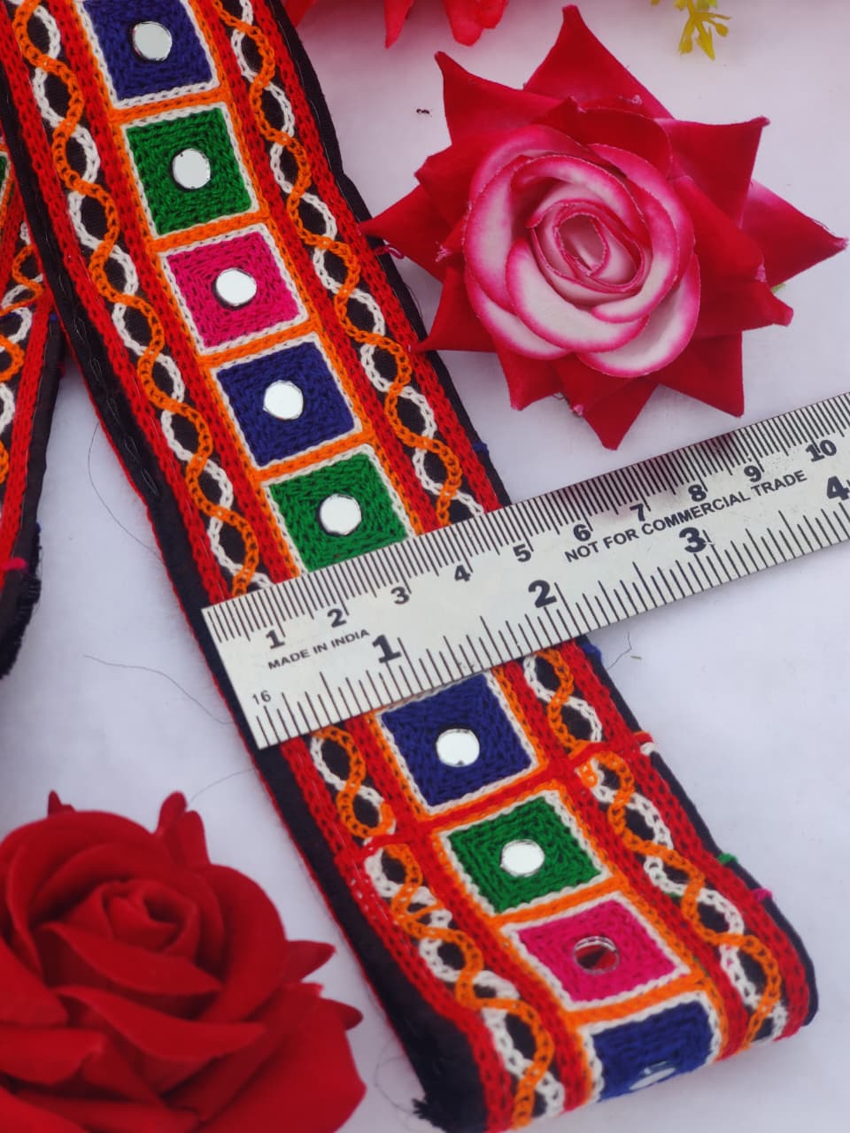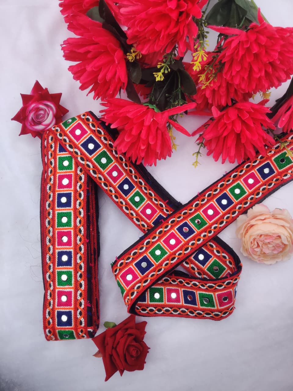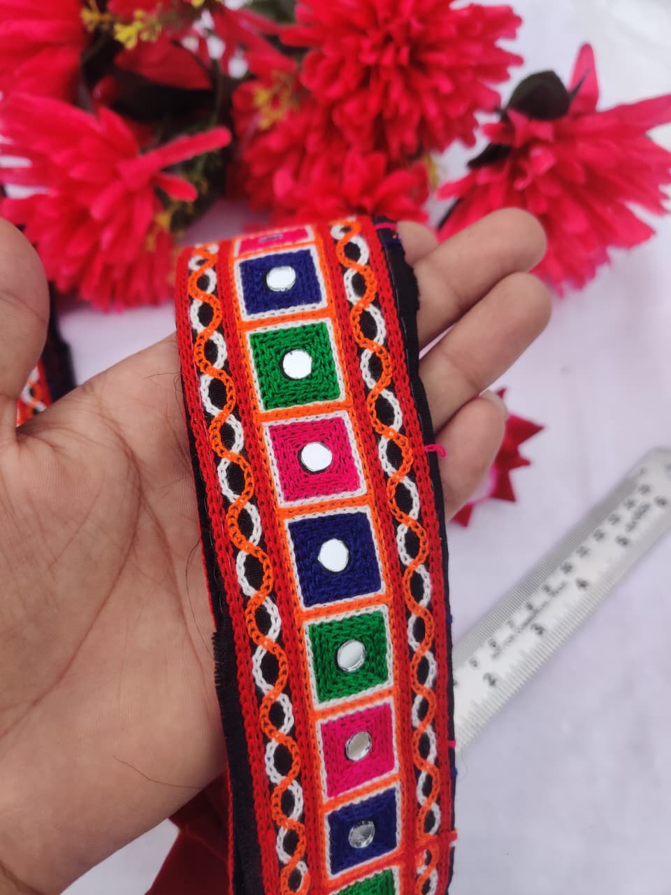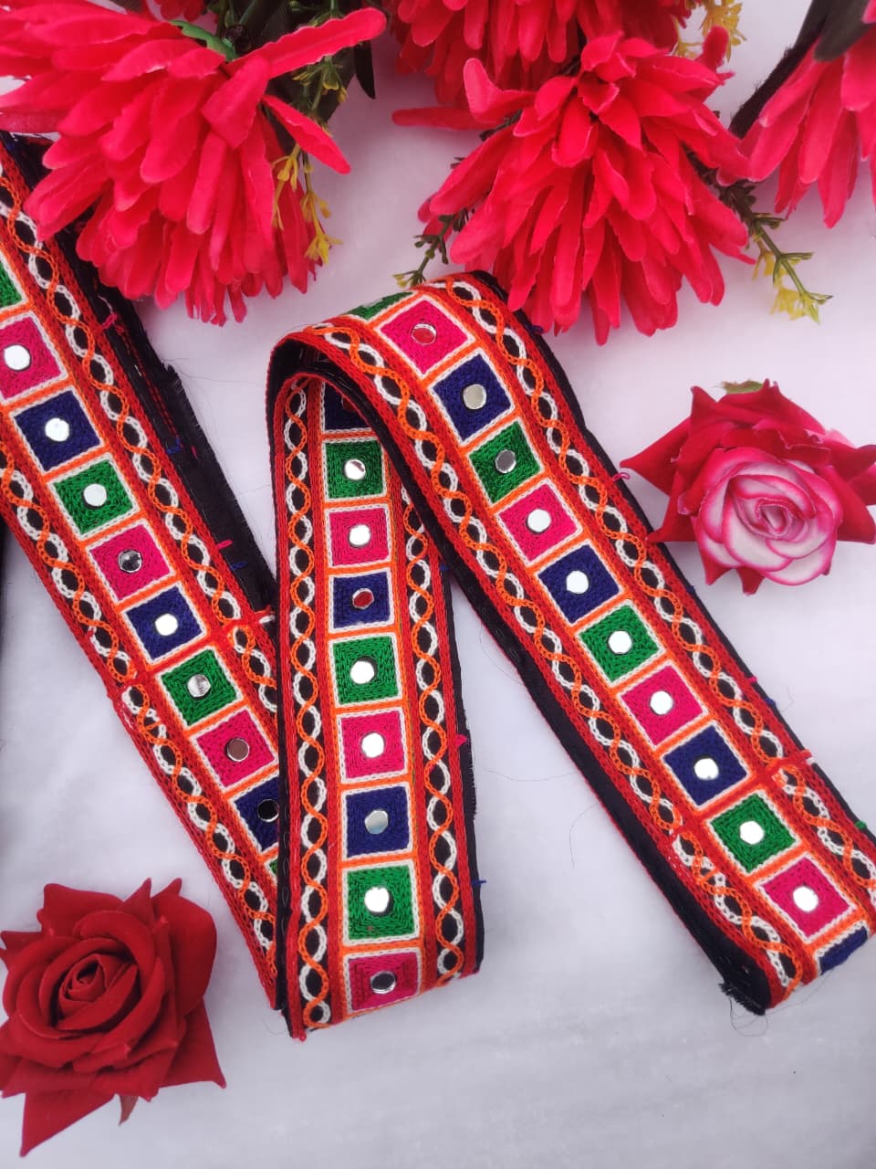varniart traditional gamthi kachhi miror work lace border use for navratri collection, saree ,suits, dupattas, chaniyacholi, decoration,merrage collection , art and craft , etc…(9meter, 65mm width)-S 453