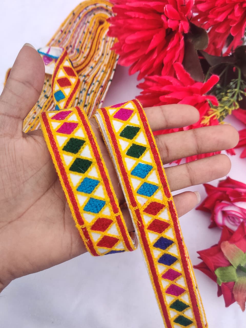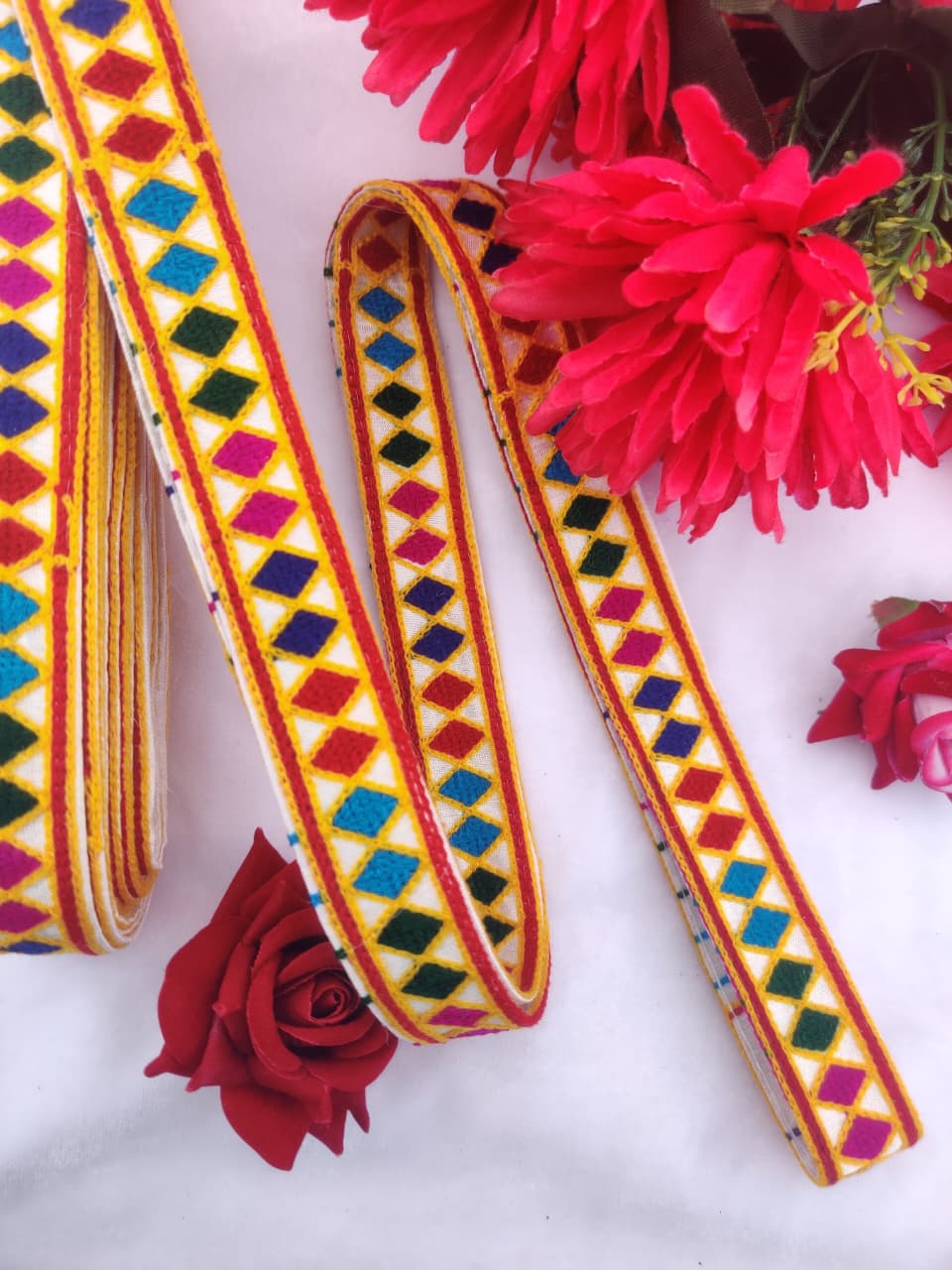 Add a pop of color and traditional charm to your garments or home decor with this stunning Phulkari lace border trim. Featuring a vibrant geometric pattern with intricate embroidery, this lace is perfect for adding a decorative touch to your creations. The white base with yellow, red, blue, green, and pink accents makes it a versatile and eye-catching accessory.