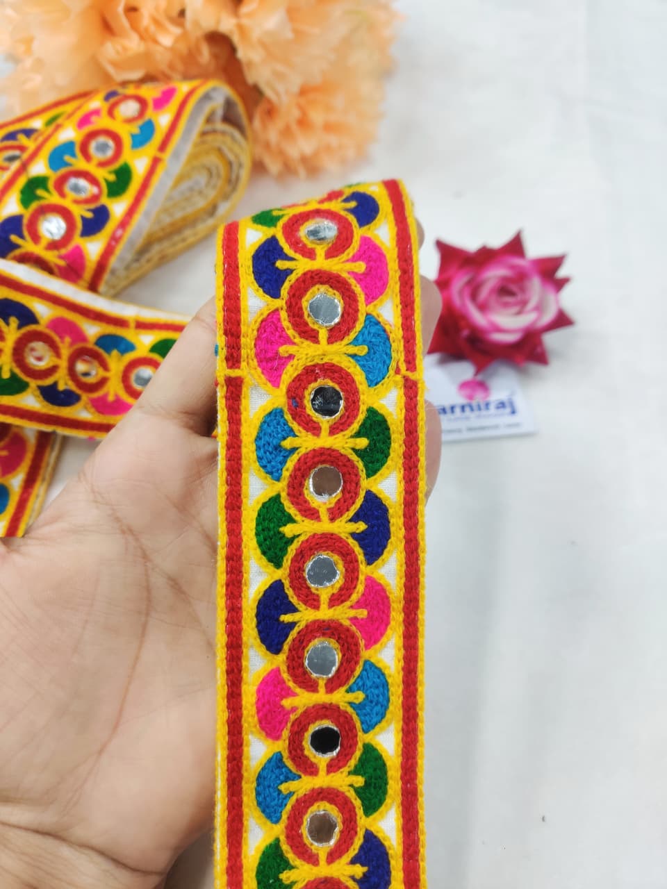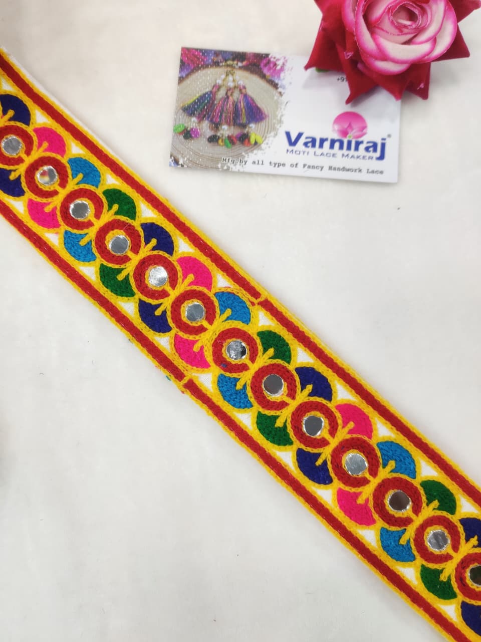 This is a traditional Kachi lace featuring intricate mirror work and colorful floral embroidery. The design is vibrant and eye-catching, with a repetitive pattern of circular mirrors surrounded by detailed stitching in bright colors like red, yellow, blue, and green. The lace has a soft, yet durable texture, and the mirrors are securely embedded in the threadwork.