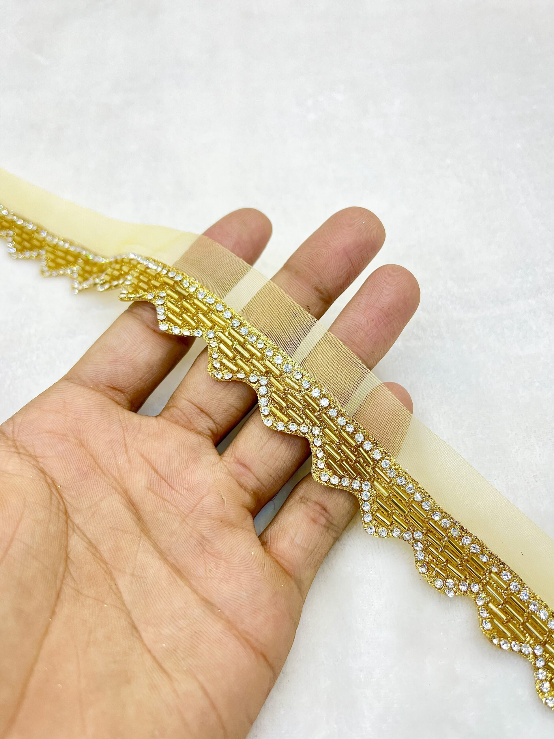 Yeh premium quality white designer lace ek elegant zigzag pattern ke saath aati hai, jisme white bugle beads (tube moti) ka fine work aur border par high-shine crystal stones lagaye gaye hain. Is lace ka finish bahut hi clean aur royal look deta hai, jo silai ke baad aur bhi zyada chamakdar nazar aata hai. Lightweight hone ke bawajood yeh lace party wear aur bridal outfits ke liye perfect choice hai. Saree border, blouse aur kurti neck design, lehenga, dupatta aur indo-western dresses par iska use outfit ko classy aur premium touch deta hai.